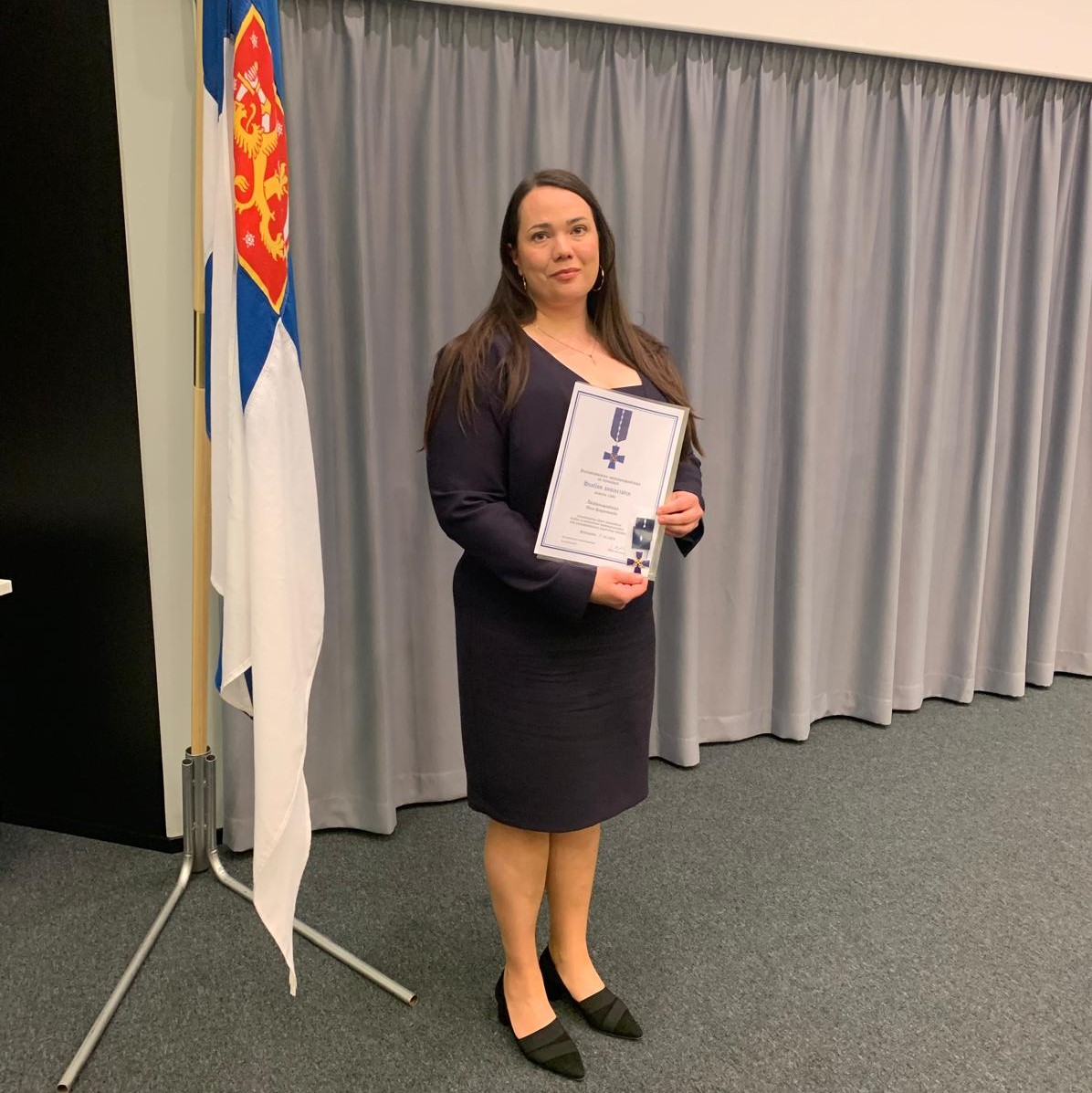 Elina Paganus, Customer Relations Manager, is awarded the Service Cross of the Defence Forces in recognition of her meritorious and excellent customer service