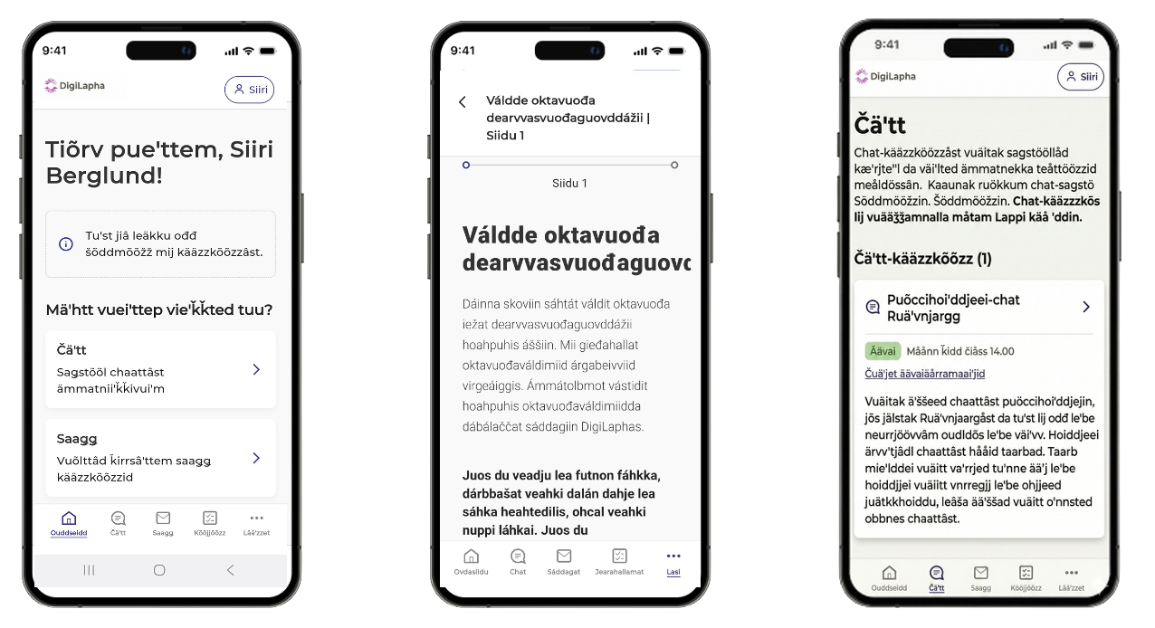Näin syntyi lappilaisten sote-palvelujen digitaalinen "etuovi", joka on suunniteltu saavutettavaksi myös saamenkielisille käyttäjille. On harvinaista, että julkinen digipalvelu tarjoaa asioinnin myös saamen kielillä – ja juuri tämä tekee palvelusta saavutettavan Suomen ainoalle alkuperäiskansalle arjen tilanteissa, joissa asiointi omalla kielellä on olennaista. DigiLapha tekee kielellisestä yhdenvertaisuudesta konkreettista: se mahdollistaa kohtaamisen ja asioinnin tavalla, jossa käyttäjä voi ilmaista huolensa ja tilanteensa omilla sanoillaan.