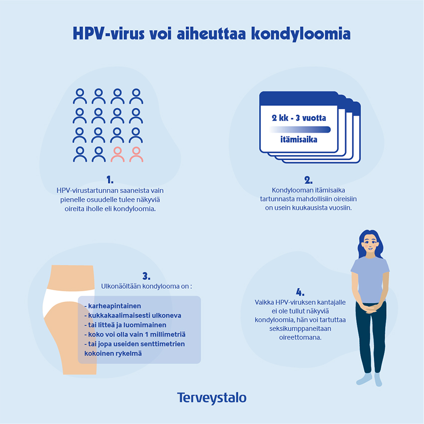 Onko kondylooma ikuinen? Virustartuntaa ei pystytä hoitamaan, mutta suurimalla osalla tartunnan saaneista virus häviää itsestään vuosien kuluessa. Myös kondyloomat voivat hävitä ilman hoitoa. Näkyviä kondyloomia pystytään kuitenkin hoitamaan paikallishoidolla tai poistamalla ne kirurgisesti. Solumuutoksia seurataan ja hoidetaan niiden vaikeusasteen mukaisesti. Koska virus ei katoa elimistöstä, uusivat kondyloomamuutokset herkästi.