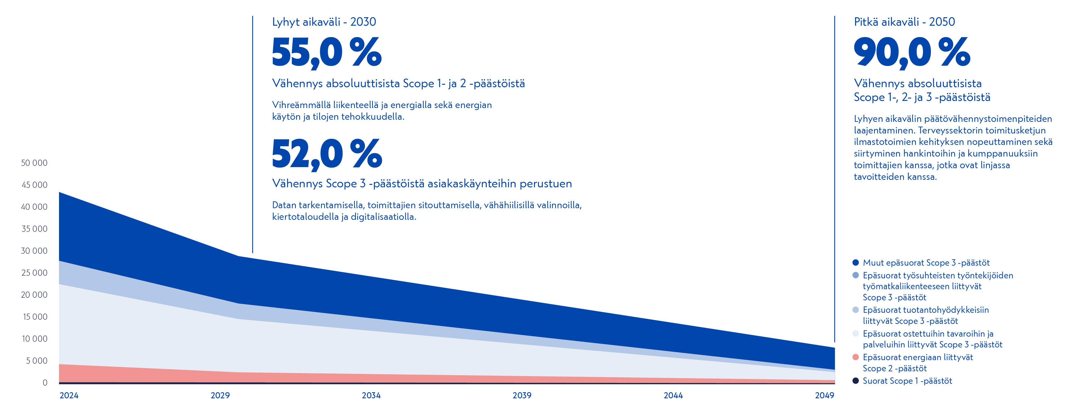 Terveystalo on ensimmäisenä suomalaisena terveydenhuollon toimijana sitoutunut saavuttamaan nettonollapäästöt koko arvoketjussaan vuoteen 2050 mennessä. Lyhyellä aikavälillä Terveystalo sitoutuu vähentämään absoluuttisia Scope 1- ja 2 -päästöjään 55 % vuoteen 2030 mennessä vuoden 2024 lähtötasosta. Terveystalo sitoutuu lisäksi vähentämään Scope 3 -päästöjään 52 % asiakaskäyntejään kohden samassa aikataulussa. Pitkällä aikavälillä Terveystalo sitoutuu vähentämään absoluuttisia Scope 1- ja 2 -päästöjään 90 % vuoteen 2050 mennessä vuoden 2024 lähtötasosta. Terveystalo sitoutuu lisäksi vähentämään absoluuttisia Scope 3 -päästöjään 90 % samassa aikataulussa. Tavoitteet sisältävät bioenergian raaka-aineista aiheutuvat maankäyttöön liittyvät päästöt ja poistumat. Lyhyen aikavälin Scope 3 -päästöjen intensiteettitavoitteessa asiakaskäynnit on huomioitu tuhansina.
