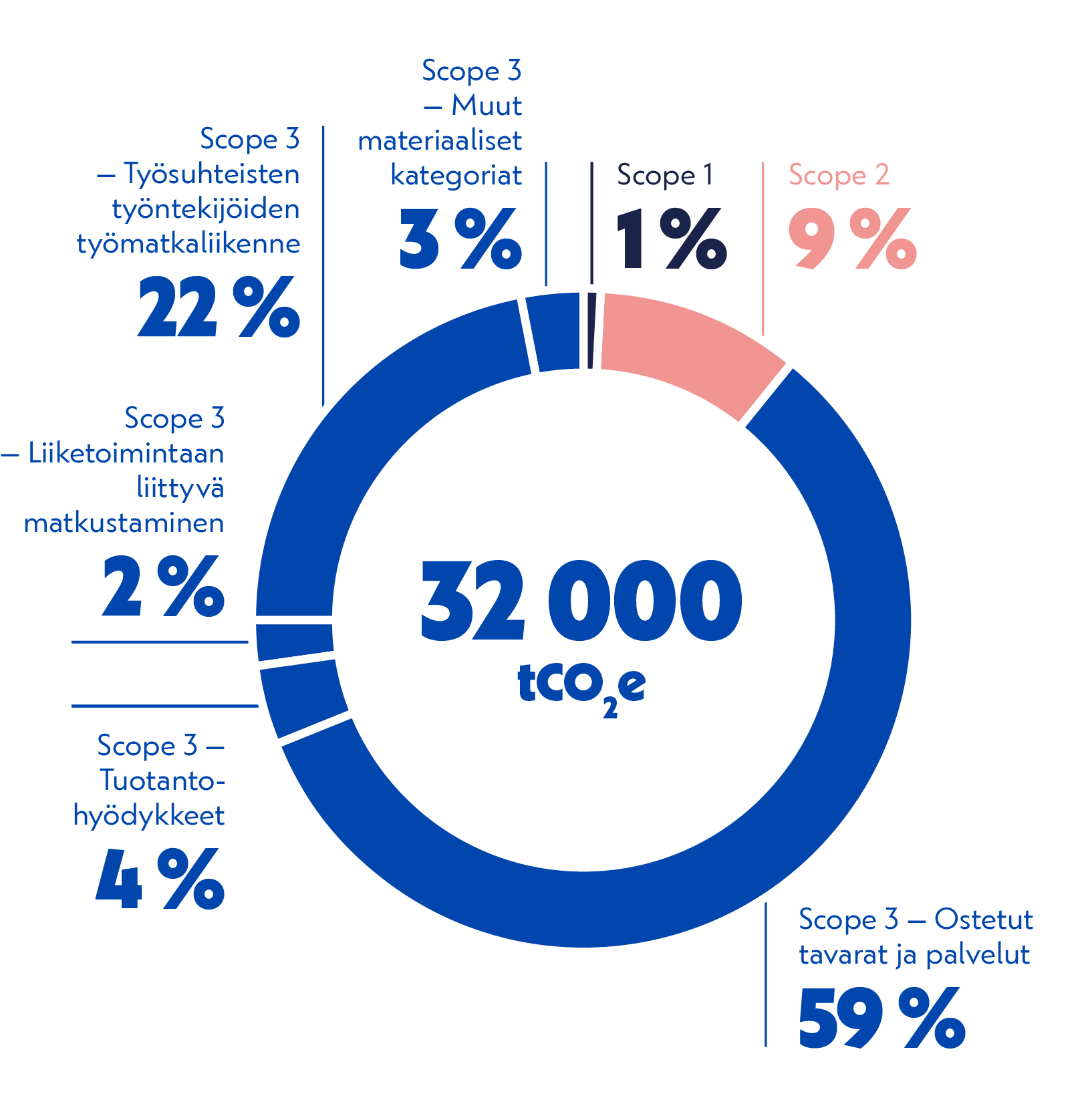 Perustuen vuoden 2025 laskentaan, suorat Scope 1 -päästöt olivat 1 % kokonaispäästöistä, epäsuorat Scope 2 -päästöt 9 % ja Scope 3 -päästöt 90 %. Laskennan perusteella suurimmat ilmastovaikutukset syntyvät epäsuorasti toiminnan kautta arvoketjun alkupäässä. Kokonaispäästöihin on huomioitu GHG Protokollan mukaisesti Scope 1, 2 ja 3 kategoriat sekä biogeeniset päästöt. Päästölaskenta on varmennettu kolmannen osapuolen toimesta.